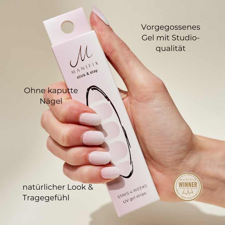 Und jetzt gibt es eine revolutionäre Methode auf dem Markt, die endlich auch den Liebling für jede Frau zugänglich machen. Mit Manifix kannst du einfach deinen blauben Babyboomer aufkleben, versiegeln und dann aushärten. Und ja, es ist wirklich so einfach. Hierfür wurde Manifix mit dem Schweizer Innovationspreis ausgezeichnet. Weil sie der Meinung sind, dass Manifix wirklich so einfach ist und genauso lange hält, wie im Nagelstudio. 84% Wiederkaufsrate bei über 60.000 Kundinnen sagen alles.