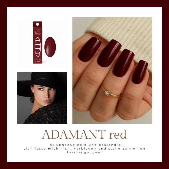 Adamant Red ist ein tiefes, sattes Dunkelrot mit glossy Finish, das an samtigen Rotwein oder dunkle Kirschen erinnert. Diese Farbe schreit nicht nach Aufmerksamkeit – sie zieht sie einfach an.