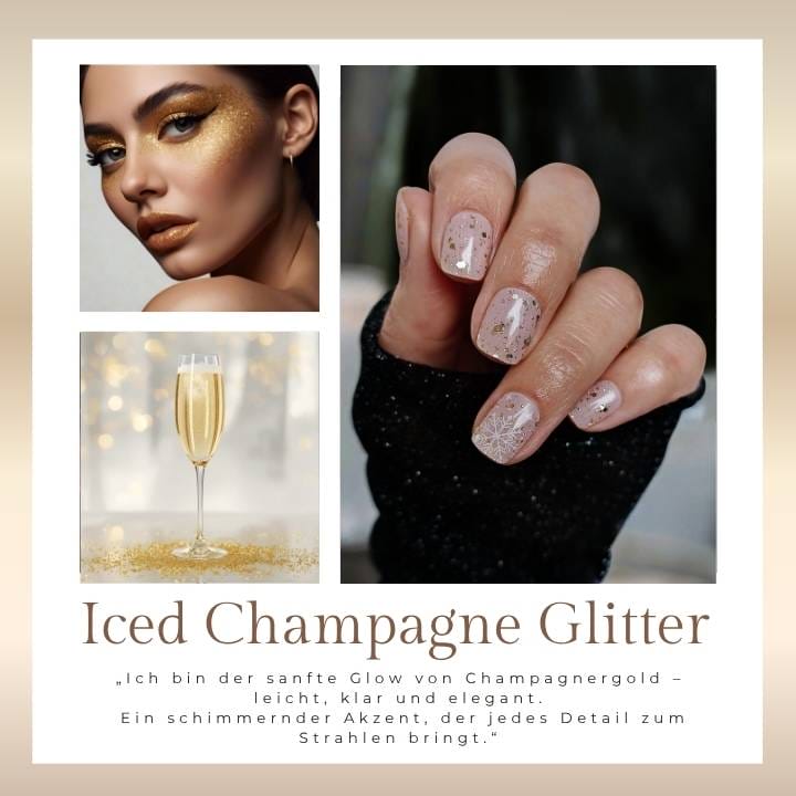 Iced Champagne Glitter ist das Funkeln eines glamourösen Winterabends – ein Mix aus zartem Champagnerschimmer und feinem Goldglitzer, der wirkt wie prickelnde Luxusmomente auf deinen Nägeln. Elegant, edel und absolut wow.