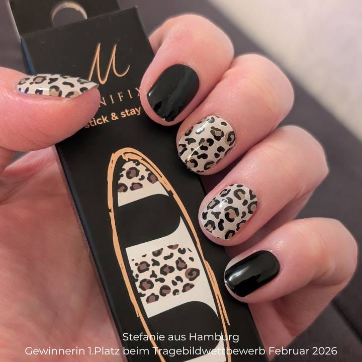 Bock auf Nägel, die richtig knallen? Die Wild UV-Nagelfolien bringen deinen Look auf das nächste Level! Mit sattem Onyx-Schwarz und frechem Leo-Print in warmem Gold-Beige bist du die Queen jeder Party. Ob rockig, wild oder einfach stylish – Nageldesign Wild ist dein perfektes Match!